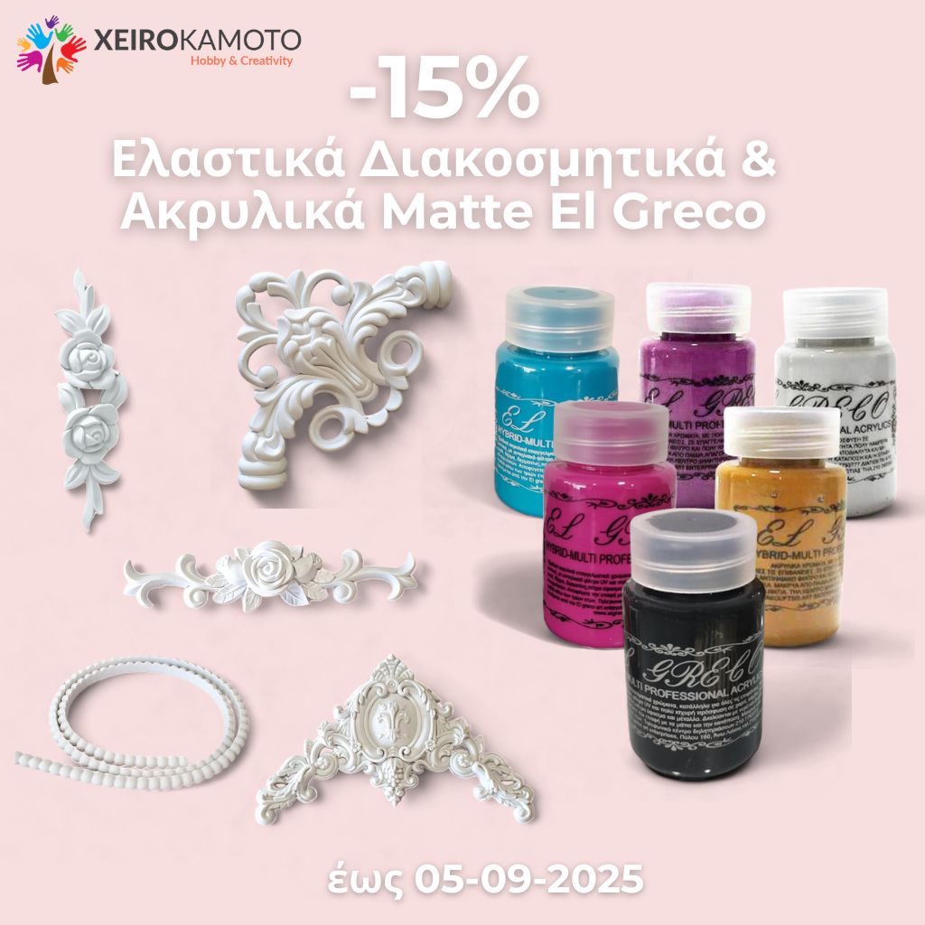 📣 Νέα Προσφορά Εβδομάδας -15% Από σήμερα και έως την Παρασκευή 5/9, Όλα τα ελαστικά διακοσμητικά στοιχεία και Όλα τα Ακρυλικά Χρώματα El Greco