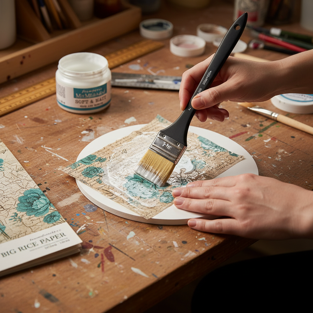 Εφαρμόστε το προϊόν με ένα μαλακό πινέλο. Ως κόλλα, είναι ιδανικό για τη συγκόλληση χαρτιού, συμπεριλαμβανομένων των σελίδων σε journaling, προσφέροντας ένα εύκαμπτο και λείο αποτέλεσμα. Ως βερνίκι, σχηματίζει ένα προστατευτικό στρώμα που, αφού στεγνώσει πλήρως, μπορεί να δεχθεί περαιτέρω επεξεργασία, όπως σφραγίδες ή βαφή. Συνιστάται να διατηρείται το καπάκι καλά κλειστό μετά τη χρήση.