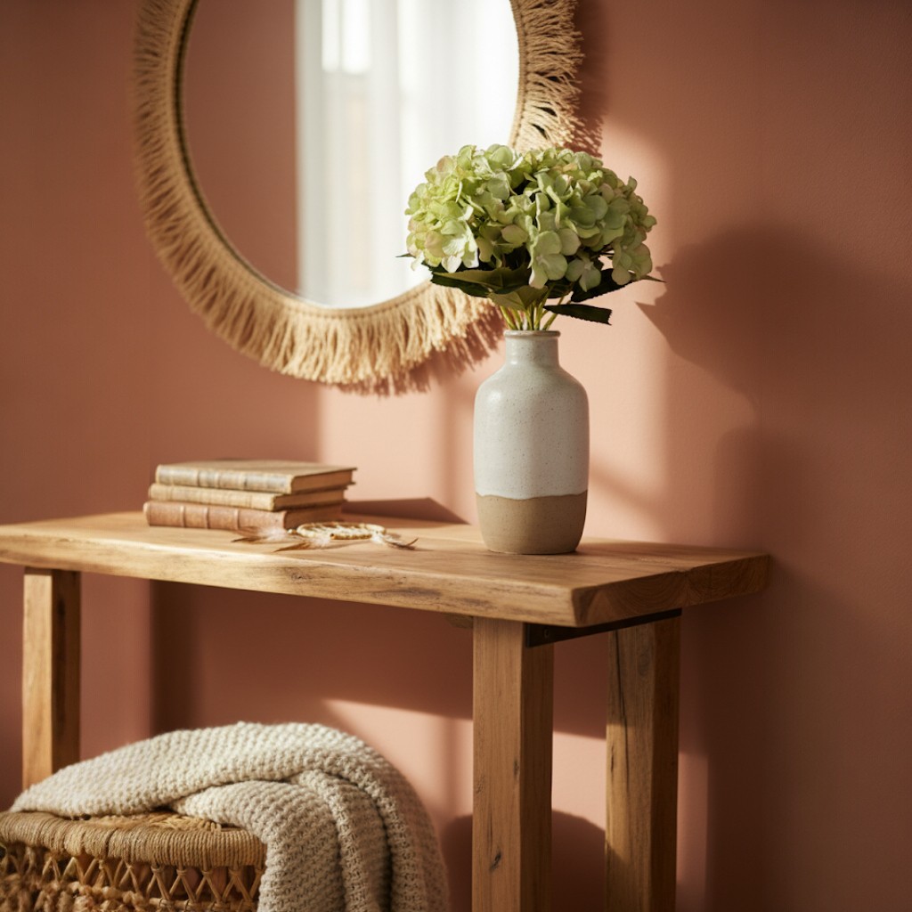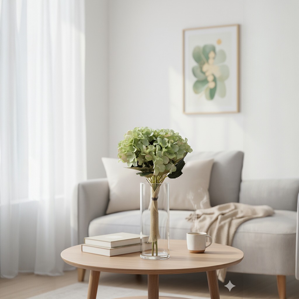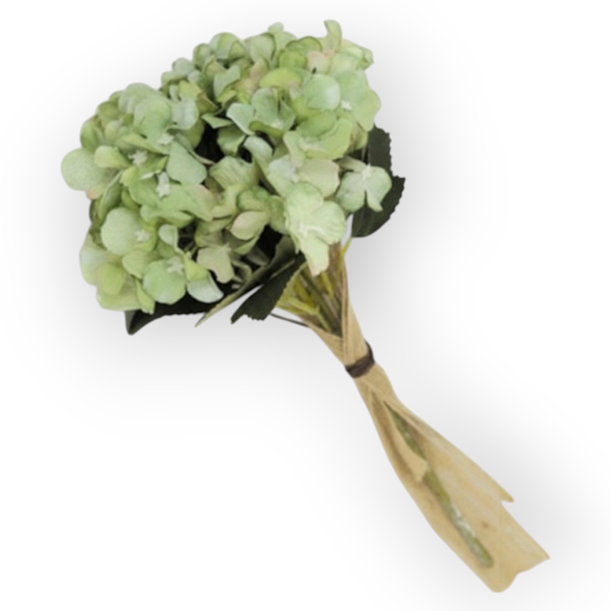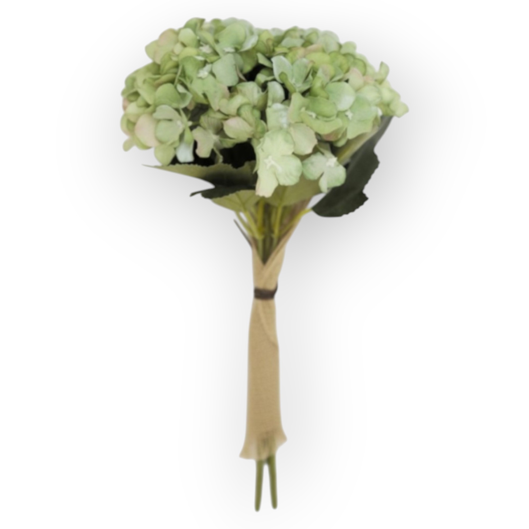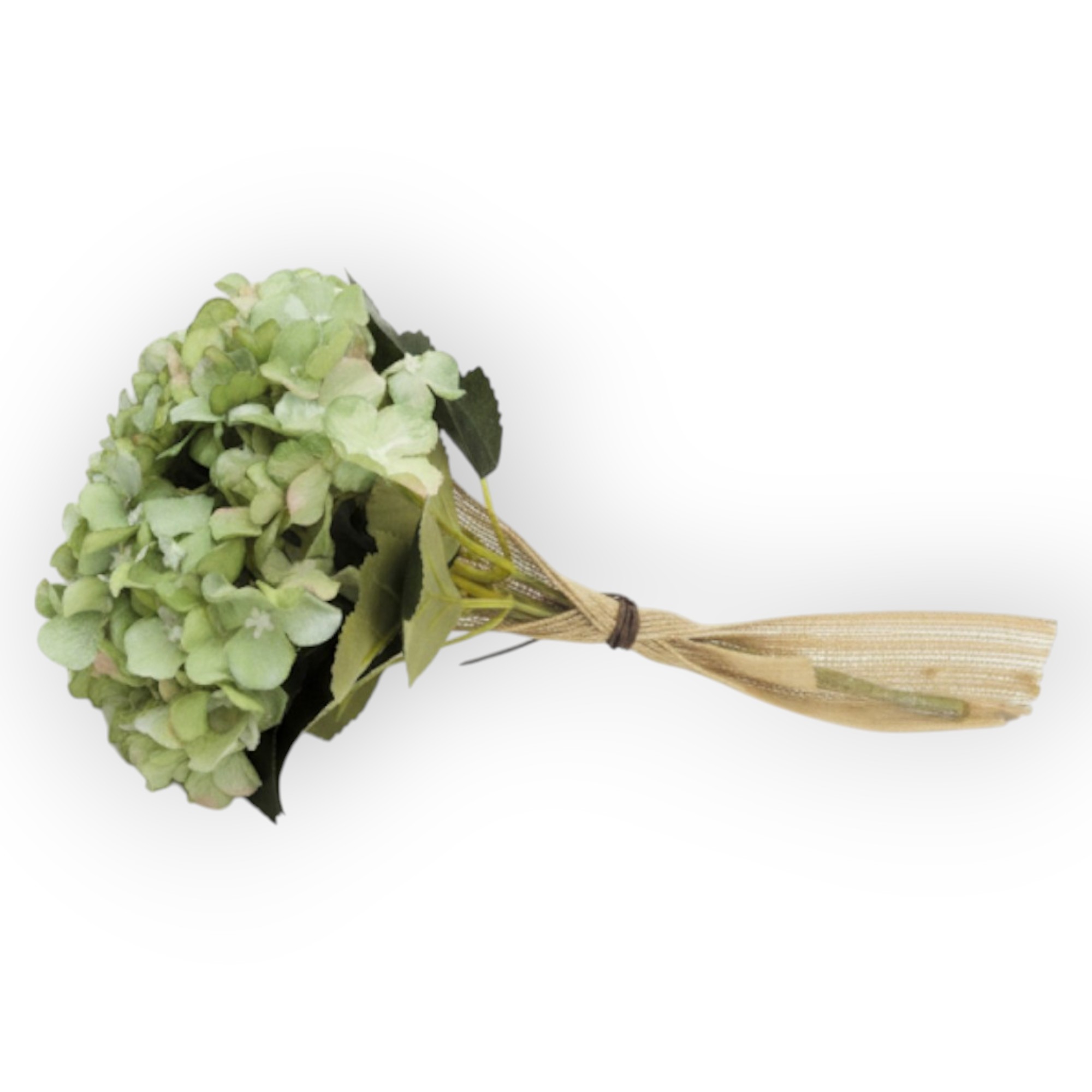 Οι πράσινες ορτανσίες είναι υψηλής ποιότητας, τεχνητές, και μιμούνται πιστά την εμφάνιση των αληθινών λουλουδιών, προσφέροντας διαχρονική ομορφιά χωρίς την ανάγκη συντήρησης. Η δέσμη συγκρατείται από φυσική λινάτσα, ενισχύοντας τον ρουστίκ και vintage χαρακτήρα του συνόλου.
