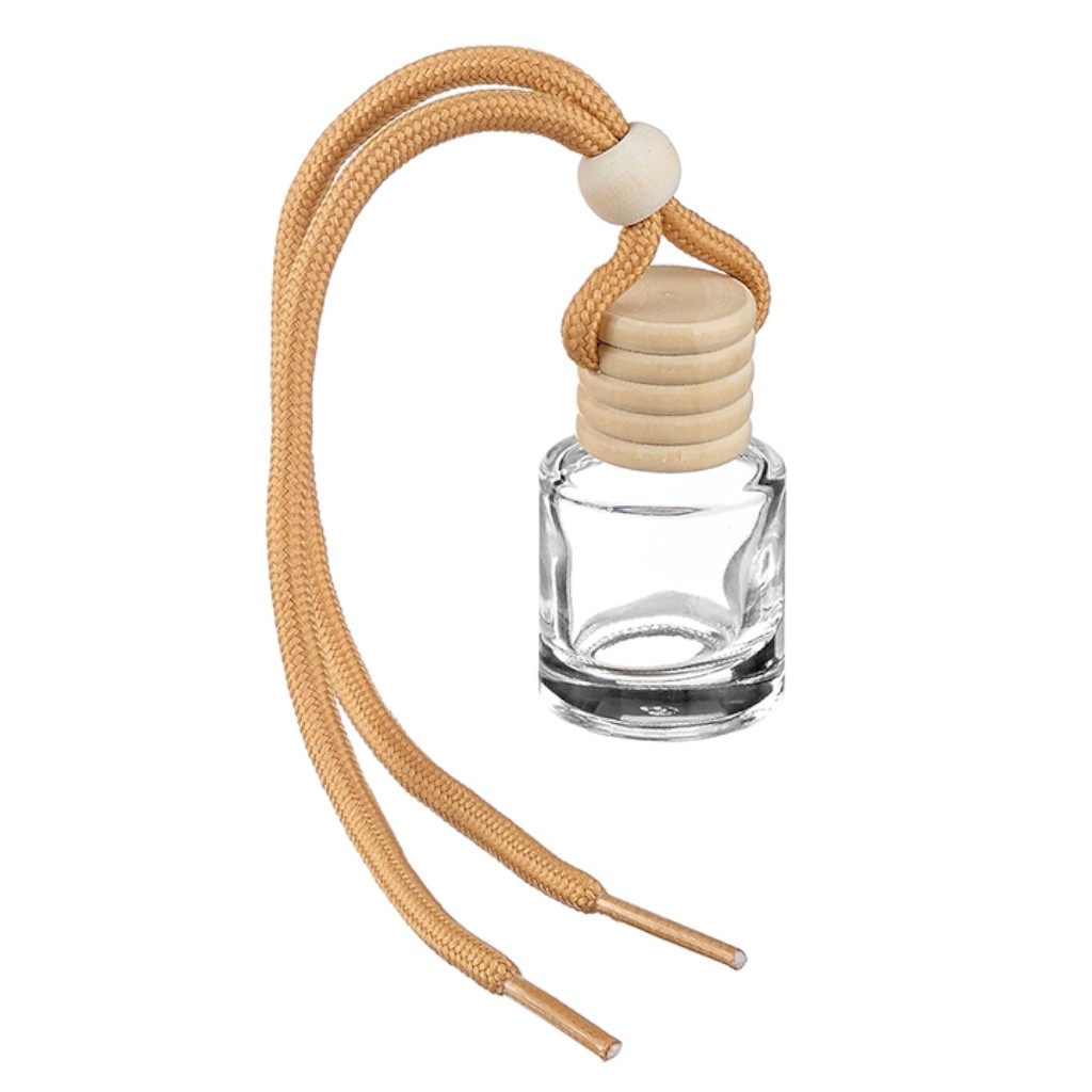Φιάλη Αρωματικού αυτοκινήτου στρογγυλή 3x5cm 10ml  για αρωματικό αυτοκινήτου, με ξύλινο πώμα διάχυσης και κορδόνι για ανάρτηση. Κομψός, λιτός σχεδιασμός, ιδανικός για DIY projects με αιθέρια έλαια ή αρώματα χώρου.